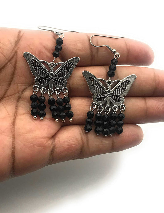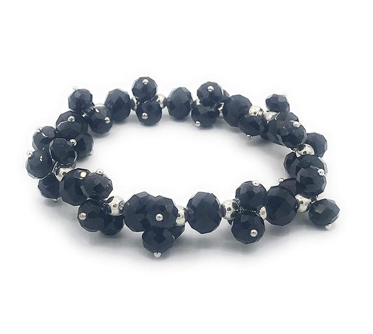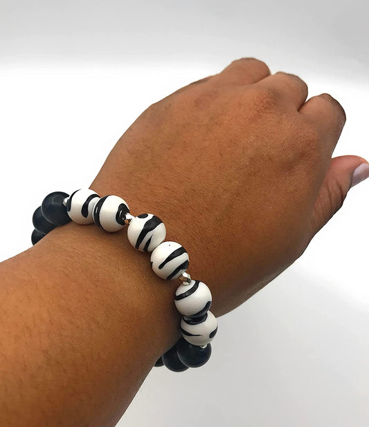 Black and White Beaded Stretch Bracelet with Silver Accents