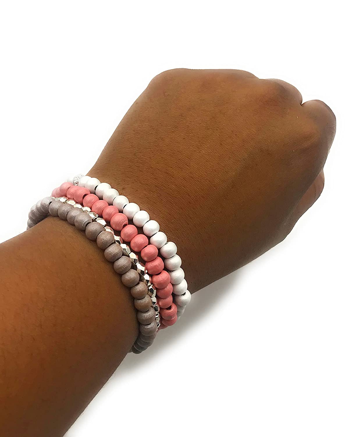 Set of 4 Beaded Stretch Bracelets in Pink Grey and White with Silver Accent
