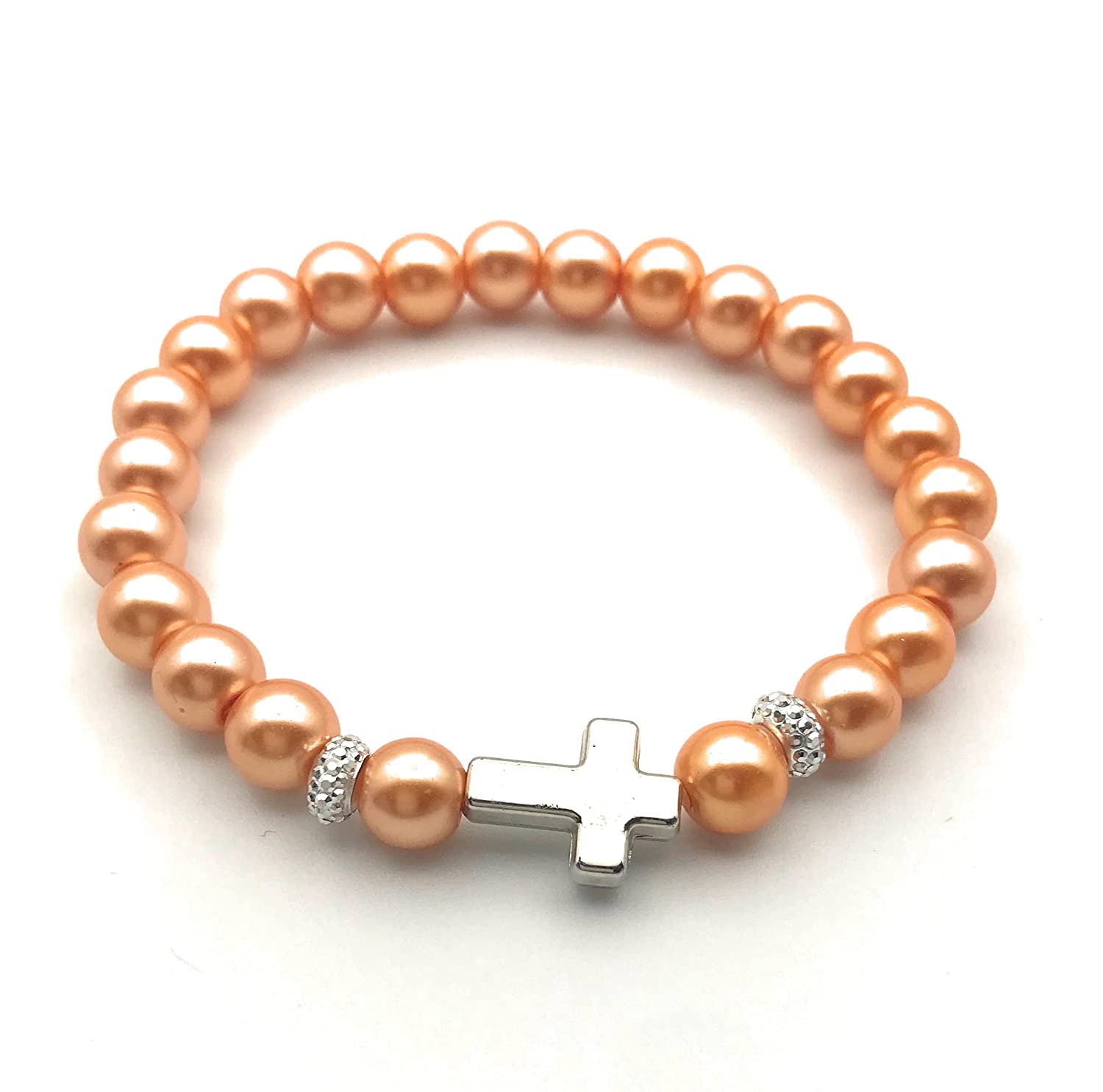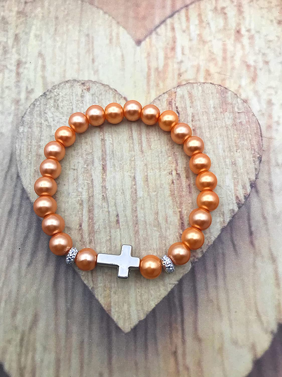The bracelet features a simple yet elegant design that is perfect for everyday wear or for special occasions. The beaded design of the bracelet gives it a textured look and feel that adds depth and dimension to the piece. The cross accent is a beautiful addition that adds a touch of religious significance to the bracelet. The bracelet measures approximately 7 inches in length, which is a standard size for most wrist sizes. The stretch cord makes it easy to put on and take off, and it comfortably conforms to the shape of your wrist. The orange color of the faux pearls is perfect for adding a pop of color to any outfit. The shade of orange is bold and vibrant, yet still versatile enough to be paired with a variety of clothing styles and colors.