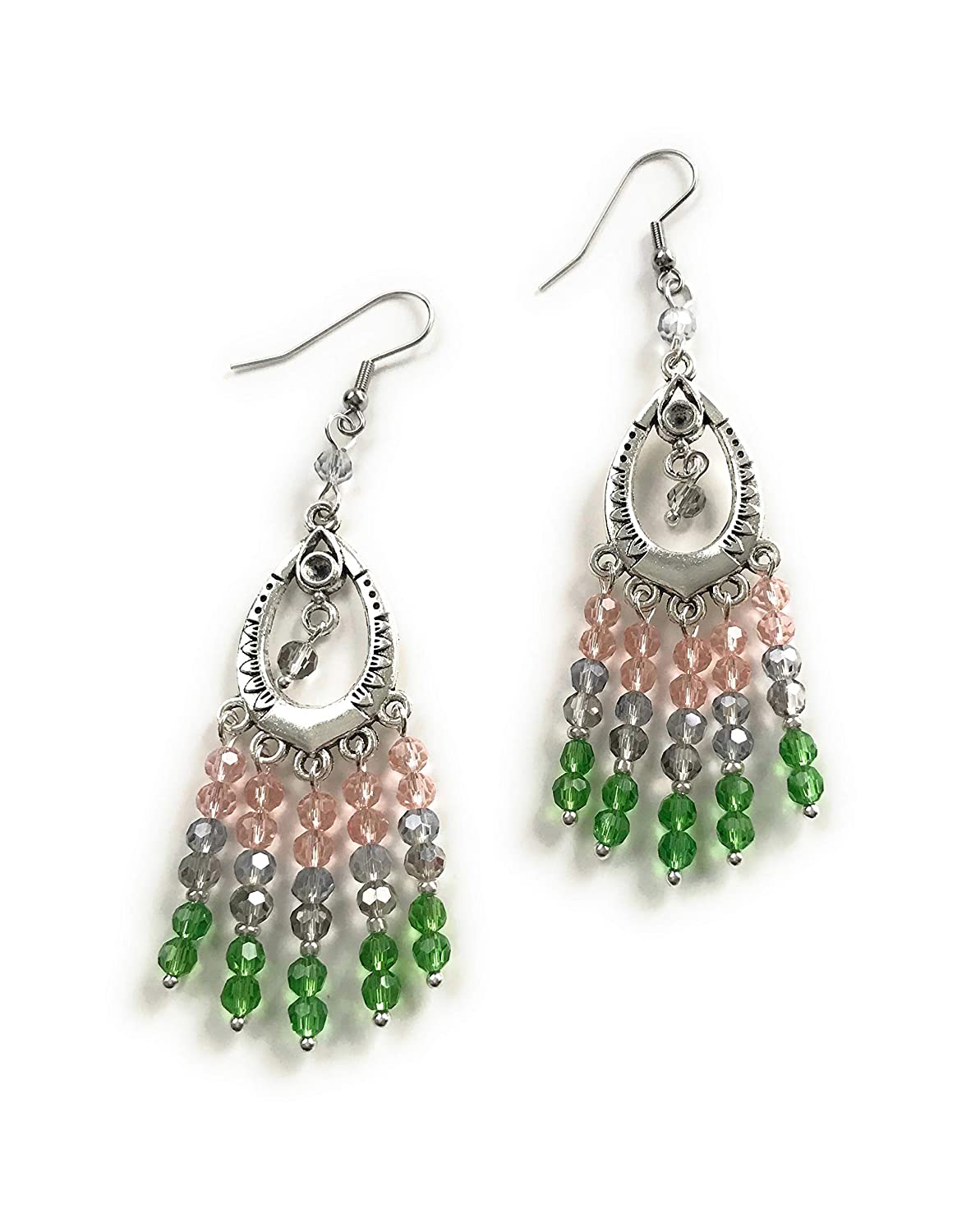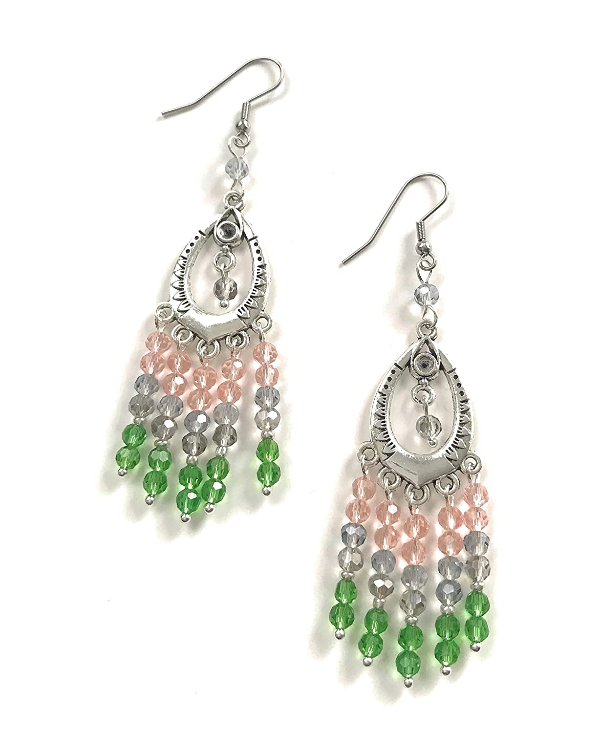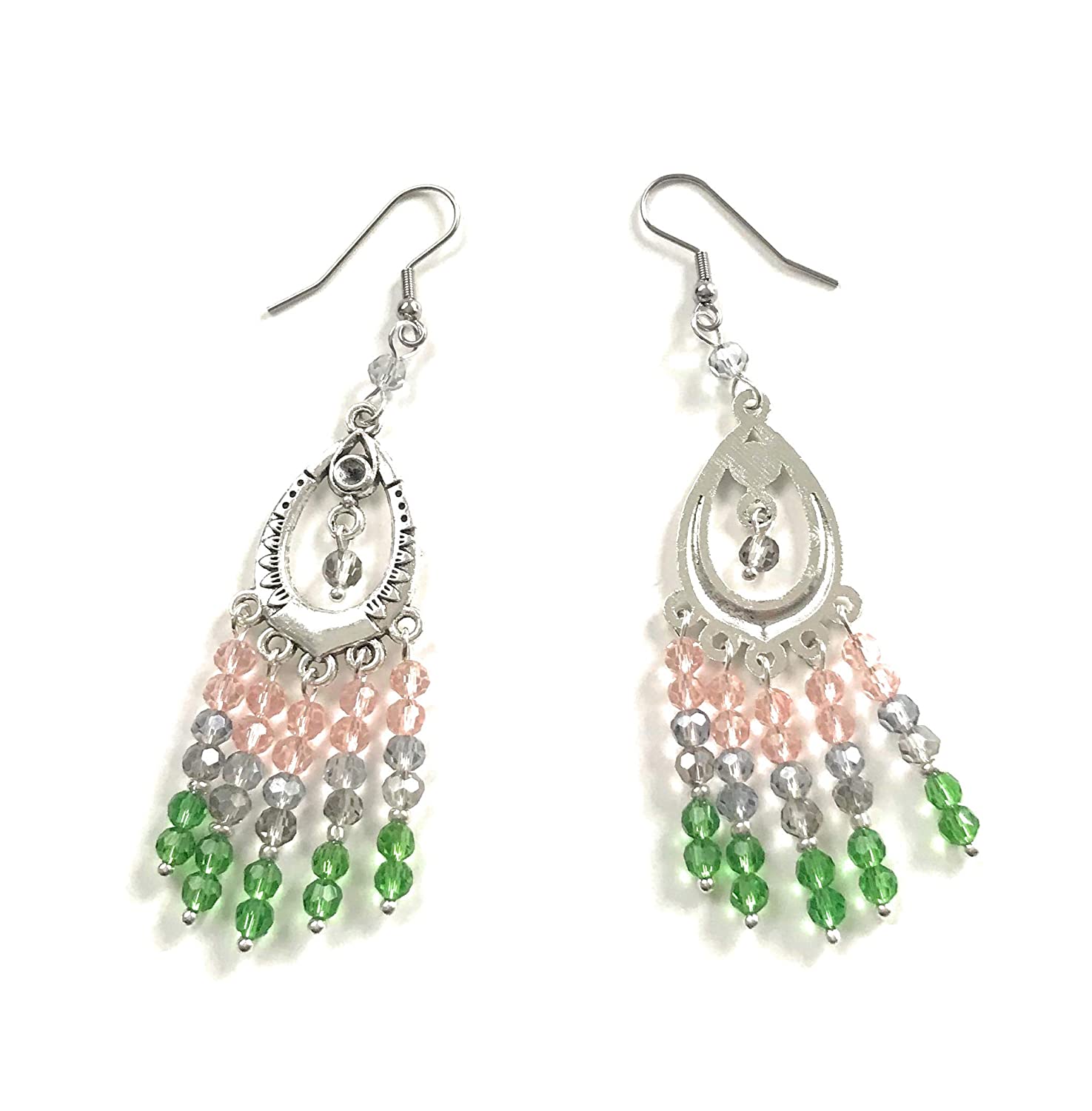 Glass crystal 3mm round beads dangle from a Tibetan silver teardrop shaped textured pendant. A 3mm round bead is suspended from the top of the pendant. The ear wires are made of stainless steel and are lead-free and nickel-free.